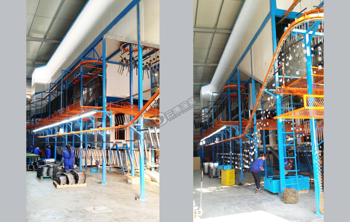 此涂裝線為電視機(jī)支架的全自動(dòng)涂裝線,采用噴淋+游浸結(jié)合的前處理工藝,此線采用立體空間布線,上下三層設(shè)備,設(shè)備最高點(diǎn)11米高,大大節(jié)省了設(shè)備安裝空間。